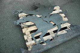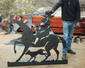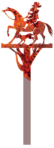 The sculptures depict a cattle drive, with two mounted drovers, cattle dogs and a seperate character – the headless horseman, which is a local legend perpetuated by a local butcher from nearby Moulamein, who was a small-time cattle duffer stealing from the herds camped at the swamp and selling his goods through the pubs across the district.